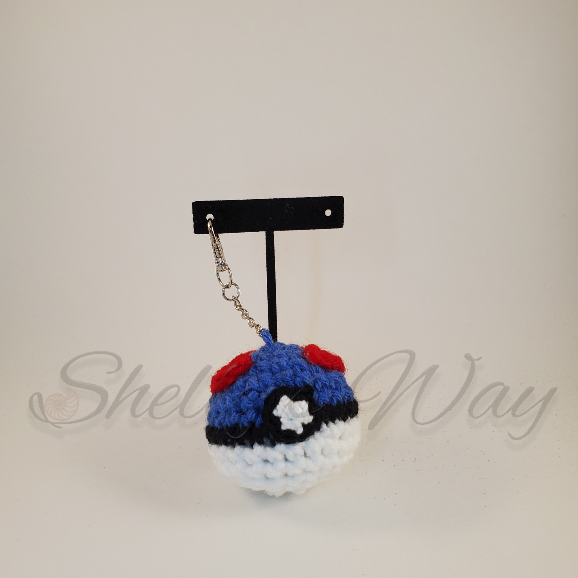 This ball is 2.5 inches in height, and is 6.5 inches around. Made with acrylic yarn. Chain and lobster clasp length is 2.75 inches.