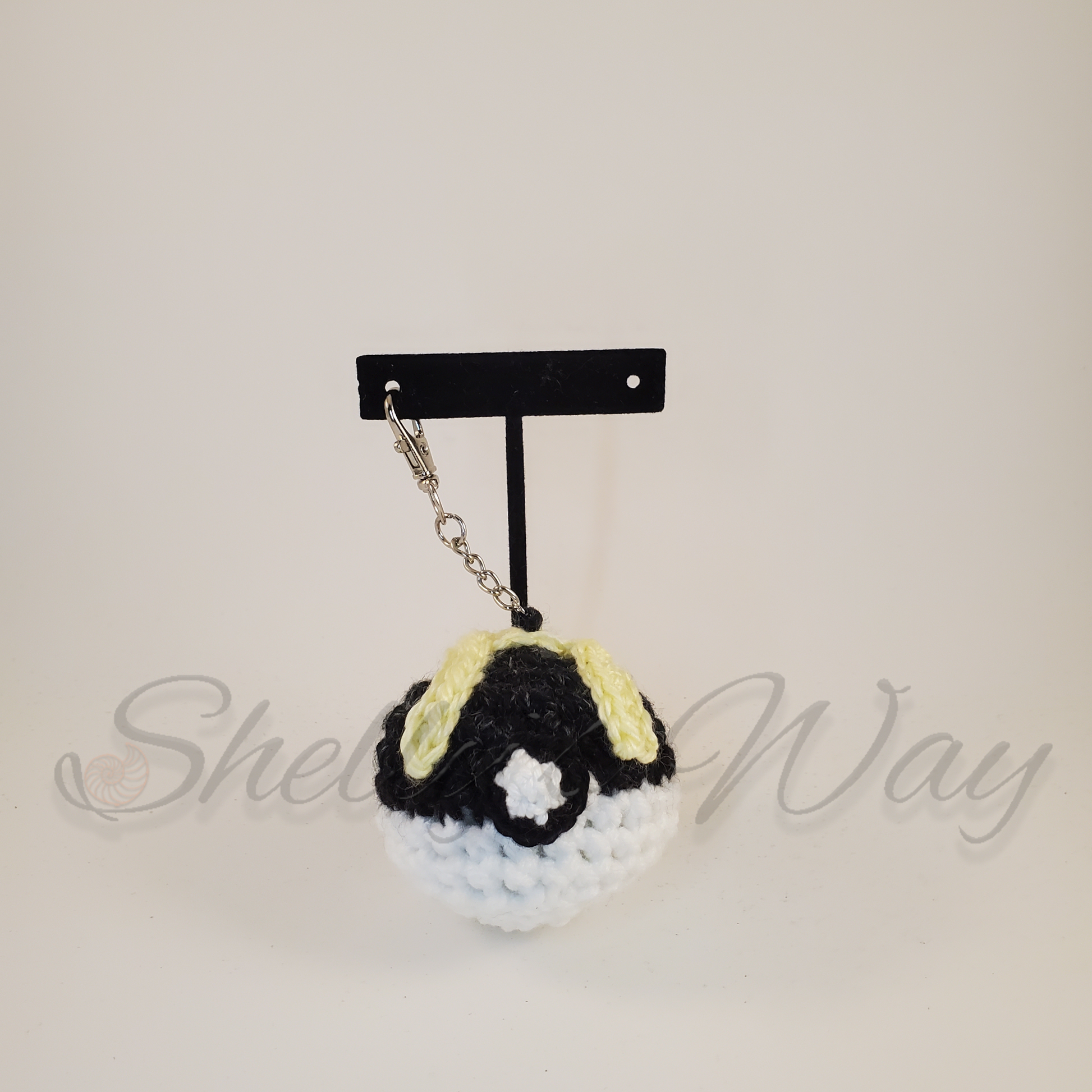This ball is 2.5 inches in height, and is 6.5 inches around. Made with acrylic yarn. Chain and lobster clasp length is 2.75 inches.